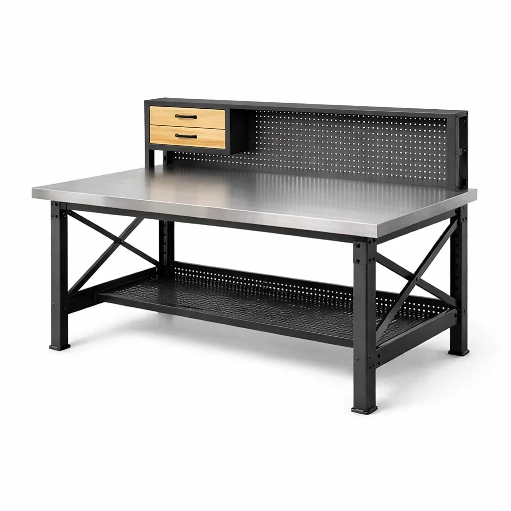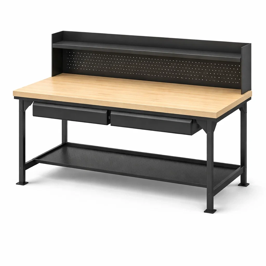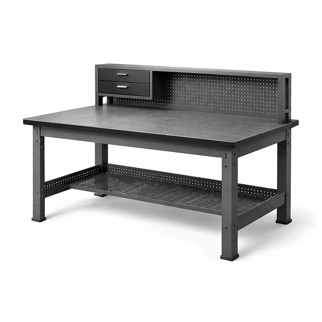 Werkbank stahl holzoptik schwarz mit schubladen