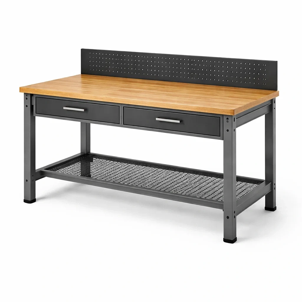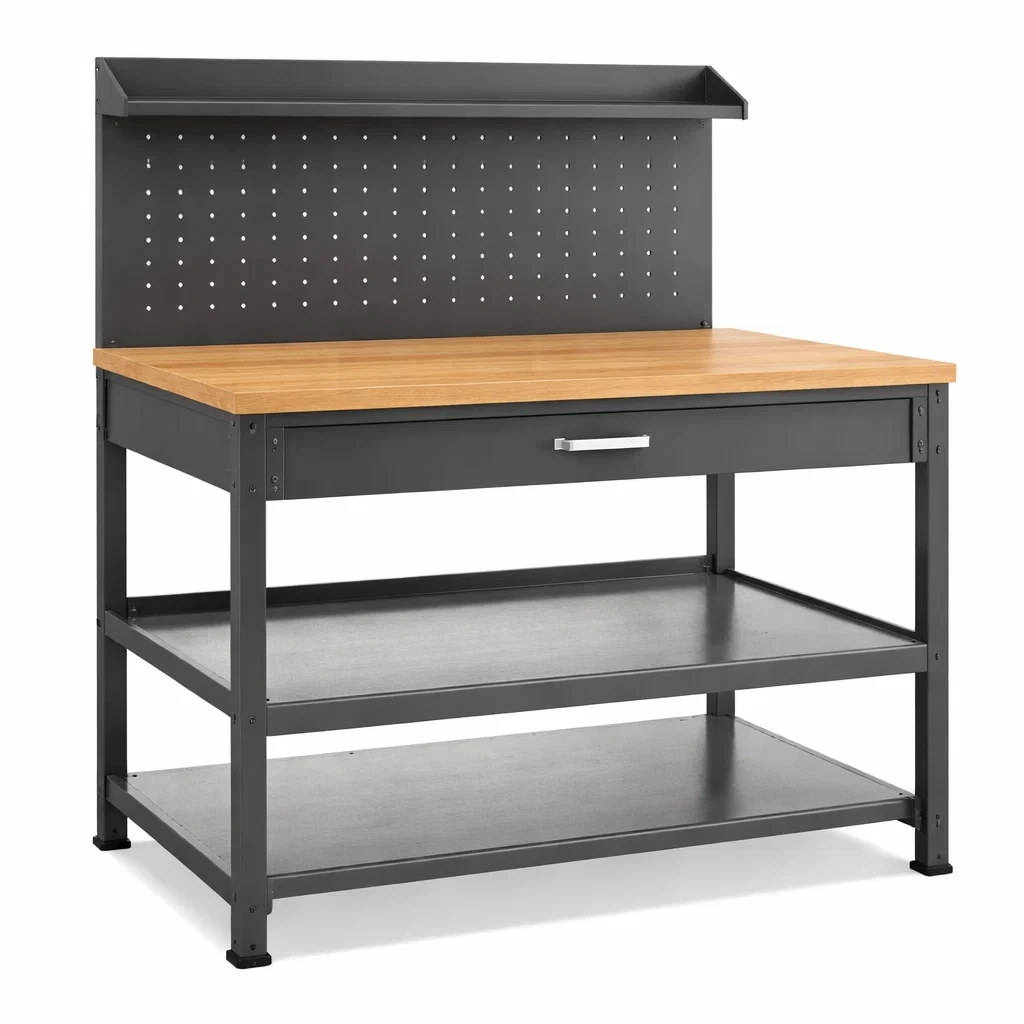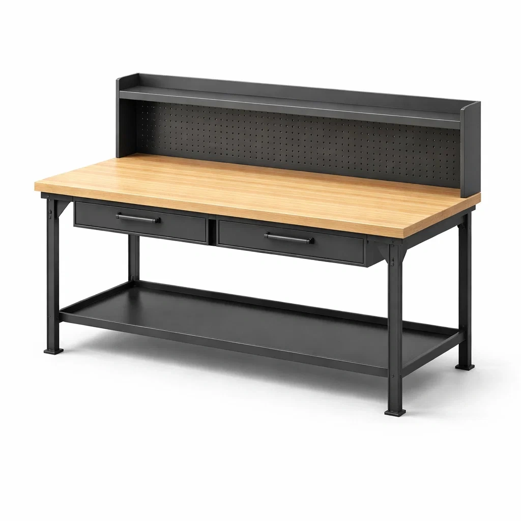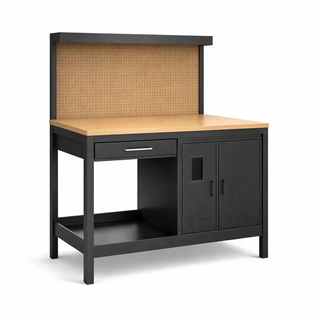 Werkbank stahl holzoptik schwarz mit schubladen